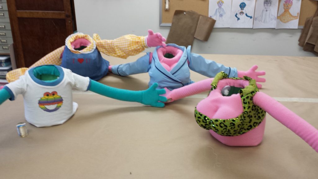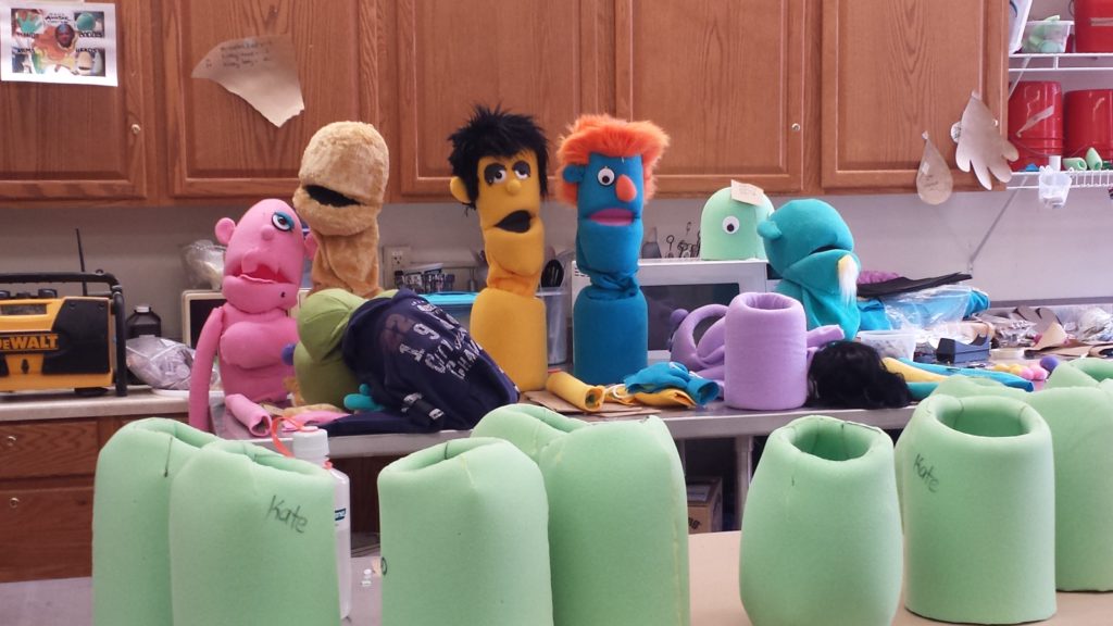 Worked on multiple puppet parts including the foam base, fur, costuming, joints, cut all male puppet hair, buttons, edge finishing and alteration for the puppeteers.